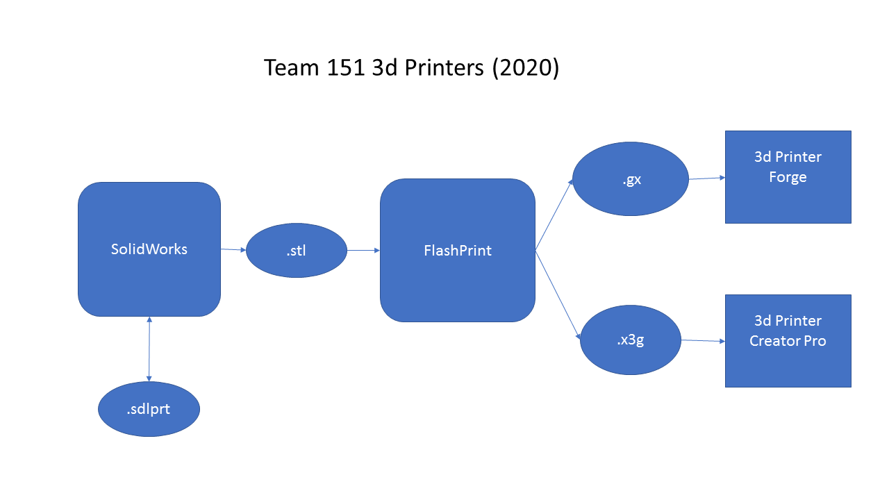The 3d printing process starts with some sort of CAD or modelling program like SolidWorks. A model of the part is created using this program. Once the model is complete, these programs have the capability to export the model into a STL (stereo lithography) file. The STL files are simply a collection of x,y,z points of the model. There is no units or material or other information in these files. They are a dumb, open source format which can be read, created or modified by a number of other programs.